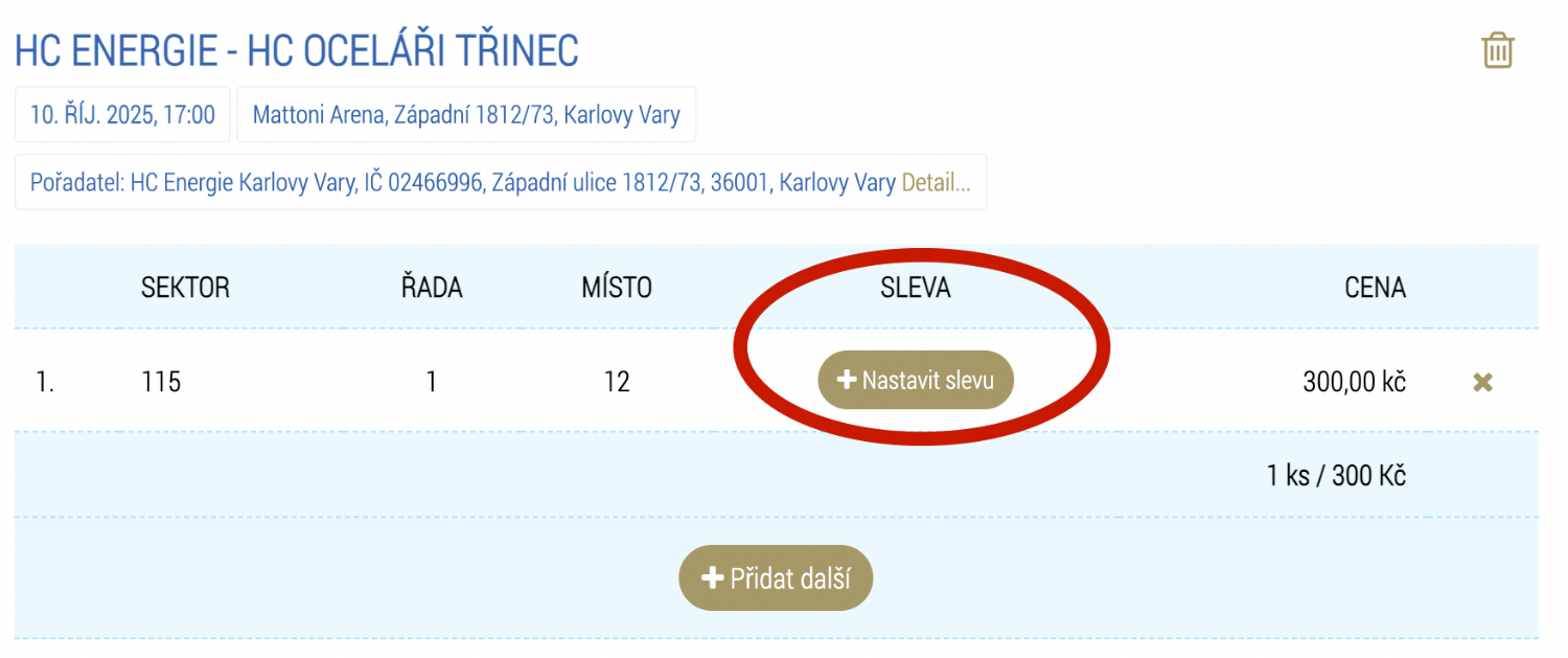Po zakliknutí vstupenky a přidání do košíku se zobrazí možnost "Přidat slevu":
