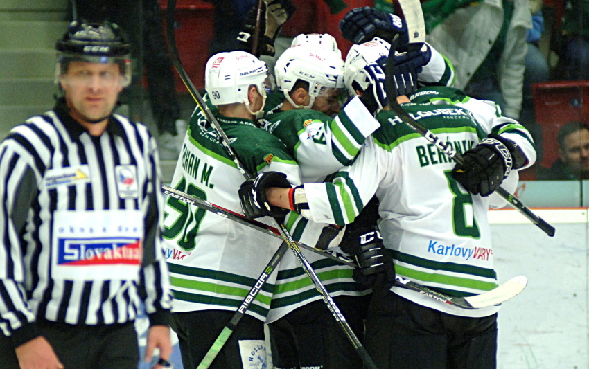 Za mohutné podpory obou kotlů odstartovalo utkání ve vysokém tempu, čemuž nasvědčovaly i poměrně rychlé změny aktuálně útočícího mužstva. Na obou stranách nechyběly rychlé kombinace, díky pozorným bekům se však ani jeden gólman příliš nezapotil. Brzy iniciativu převzali primárně Karlovarští, kteří jako první dokázali souvisle dotírat na soupeřovu klec a tato aktivita záhy vyústila v přesilovou hru pro domácí mužstvo. V něm tlak energetiků ještě narostl a Petr Kváča se prakticky vůbec nezastavil, přesto dokázal předvést několik důležitých zákroků a skóre díky tomu zůstalo beze změny. Velice rychlý styl hry nadále více seděl domácím, kteří pokračovali ve kvalitní defenzivní práci, dokonce hrozili ve vlastním oslabení a puk tedy drželi převážně ve svém útočném pásmu. Tvrdost hokeje pocítil v polovině periody jeden z hlavních arbitrů utkání, který byl nepříjemně zasažen kotoučem do kolena, po krátkém ošetření se však dokázal vrátit na led. Atraktivní výkony začala obě mužstva zpestřovat tvrdou hrou a k vidění bylo i několik drobných rozmýšek v mezích pravidel, přesto se však stále nikomu nedařilo skórovat. Tomu učinil přítrž až šest minut před koncem třetiny hostující Luboš Rob, který zůstal zcela nehlídaný před domácí brankou a po chybě v karlovarské rozehrávce využil výbornou příležitost přesným projektilem k tyči. Poměrně nečekaná branka ještě více rozvířila pohyb hráčů po ledě a nakonec se ještě před první sirénou podařilo Energii vyrovnat, v předbrankovém prostoru se nejrychleji zorientoval Jaromír Kverka a odražený kotouč uklidil za Kváčova záda. Rozjetí energetici záhy přidali další trefu, když se po milimetrové přihrávce od Ondřeje Beránka z první prosadil Dávid Gríger, a tím de facto uzavřel úvodní dějství.