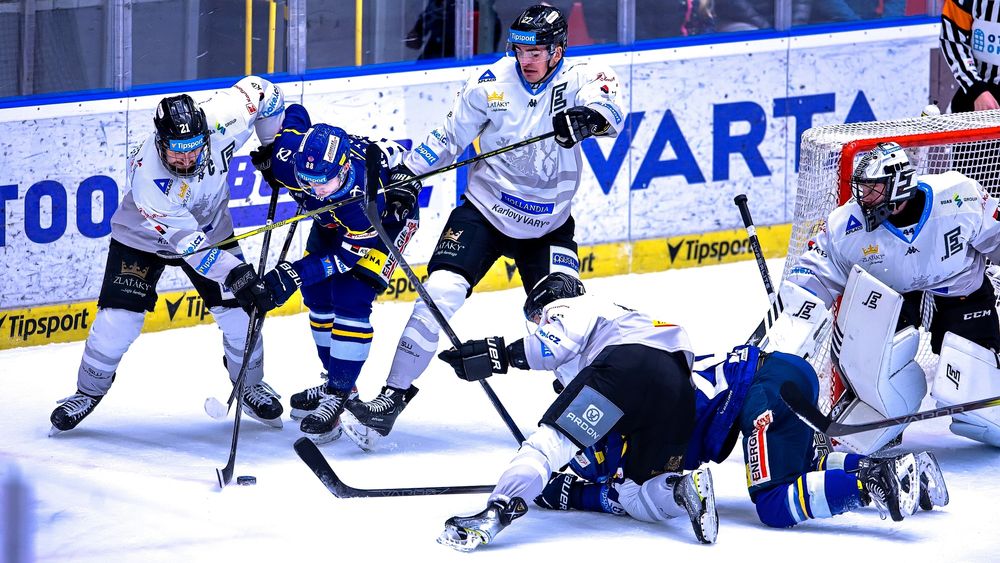 Více ze hry měli zpočátku Karlovarští. Joona Huttula už pár minut po začátku utkání rozezněl tyč. V 5. minutě mohl Dominik Hrachovina znovu děkovat dobře postaveným tyčkám ve své brance, když si na modré čáře udělal prostor Michal Plutnar, který taktéž orazítkoval pouze tyč. Vyrovnaný počet střel v první třetině svědčí o vyrovnané hře. Banes zahrozil v samotném závěru, po Gulašově nabídce byl sám před brankou Ordoš, ale Frodl vytasil svůj bezon a postaral se i o dorážku na břevno. První dějství tedy skončilo za stavu 0:0.